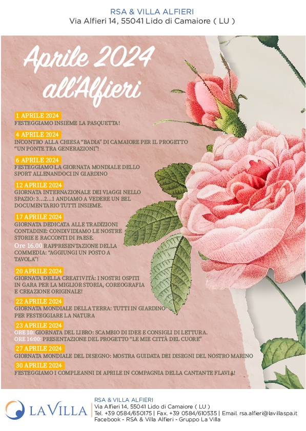 Ad aprile non ci si annoia a Rsa & Villa Alfieri di Lido di Camaiore: dalle festività di inizio mese fino alle tante attività di musica, teatro e sport scandite settimanalmente, la primavera si apre con un programma davvero vario e ricco, tutto dedicato ai nostri Ospiti!